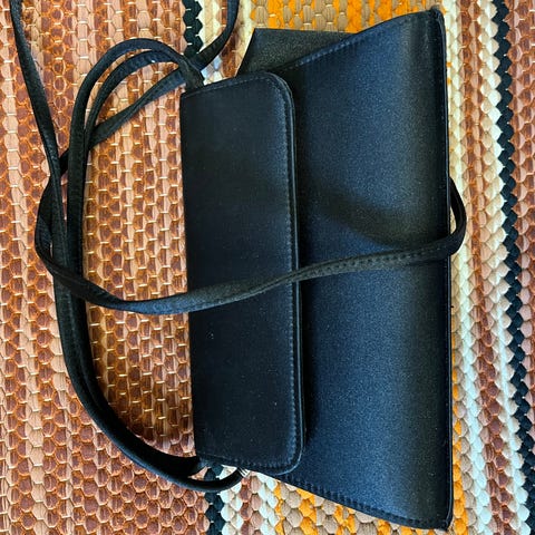 Pieni musta olkalaukku. Laukussa on läppä, joka sulkeutuu nepparilla, sekä sisäpuolella vetoketjullinen osio. Materiaali vaikuttaa olevan nahkajäljitelmä. Säädettävä olkahihna mahdollistaa laukun kantamisen olalla tai olan yli. Sopii esimerkiksi arjen peruslaukkuna tai pienenä iltalaukkuna, johon mahtuvat tärkeimmät pientavarat kuten puhelin, avaimet ja lompakko.