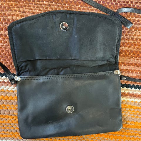 Musta olkalaukku, jossa pitkä säädettävä olkahihna. Laukussa on läppäkansi ja magneettikiinnitys. Sisäpuolella on vetoketjutasku ja avointa tilaa pienille tavaroille, kuten puhelimelle, lompakolle ja avaimille. Sopii arjen käyttöön tai juhlaan pienenä käsilaukkuna.