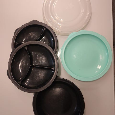 Kaksi syvää lautasta, kaksi isoa, kolme pientä. Yksi pienistä tummansininen, muut vaalenavihreitä. Värit näyttävät oikeimmilta ensimmäisessä kuvassa.