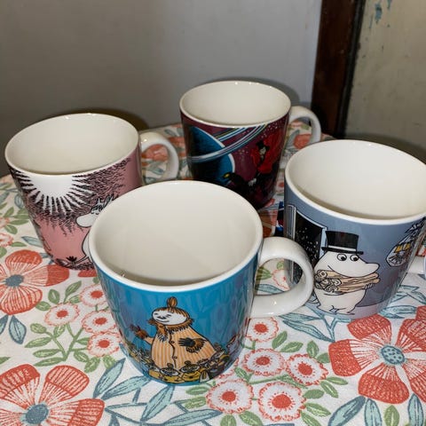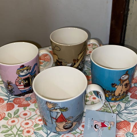 Arabia Muumi mukisetti. Settiin kuuluu kaksi keraamista Muumi-aiheista mukia, joissa on värikäs kuvitus ja 80-vuotismerkintä pohjassa.