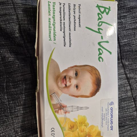 Kaupan päälle NenäFriida (sis. yksi käyttämätön filtteri) sekä alipaineella toimiva vekotin vauvan yksittäisten räkäpallojen poistamiseen.