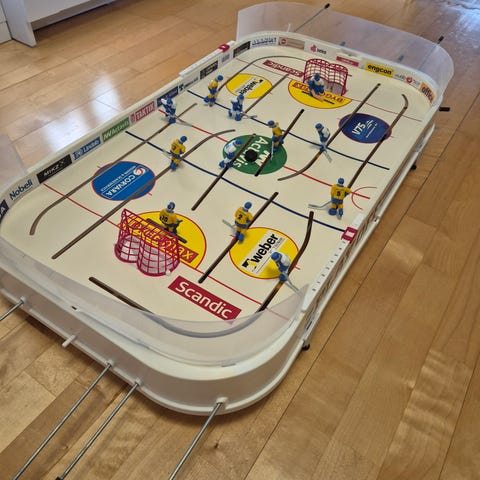 Stiga Play Off pöytälätkäpeli. Pelissä on jääkiekkokaukalo, pelaajahahmot, maalit ja ohjaustangot. Sopii pöydälle asetettavaksi jääkiekkopeliksi useammalle pelaajalle. Pelilauta on painettu mainoslogoilla ja kenttämerkinnöillä, ja pelaajahahmot ovat sinikeltaisia ja sinivalkoisia. Materiaalina pääosin muovi ja metalli.
