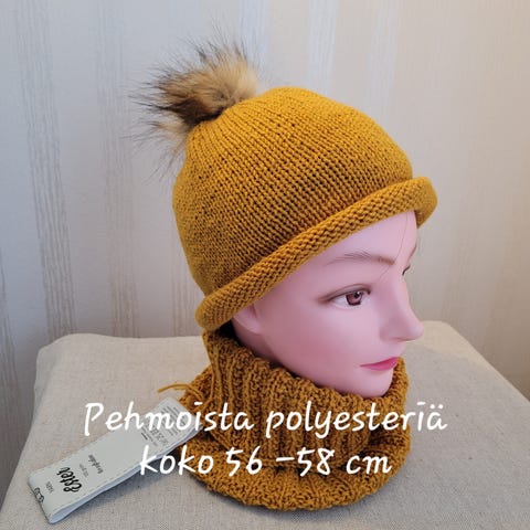 Käsinkudottu setti myssy ja tuubikauluri.