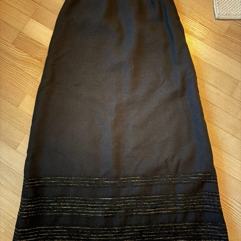 Musta, suoralinjainen malli, joustava. Materiaalina villasekoite. Edessä vetoketjutaskut ja takana napilliset koristeläpät. Pituus 60cm.