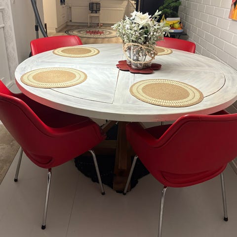 Ollut ruokapöytänä. Uniikki pöytä siistissä kunnossa. Jalat on otettu irti valmiiksi kuljetusta varten. Mutterit mukaan. 125x85.