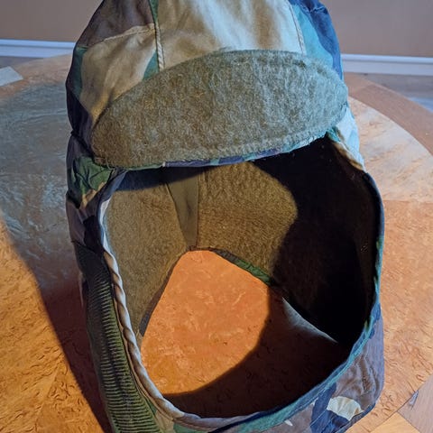Merkitön talvilakki, koko 58. Lakin päällinen on vihreäsävyistä camo-kuvioista puuvillaa ja reunat on vuorattu tekoturkiksella. Malli on korvaläpällinen ja leukaremmin avulla lakin saa kiinnitettyä. Sopii aikuiselle, päänympärys noin 58 cm.