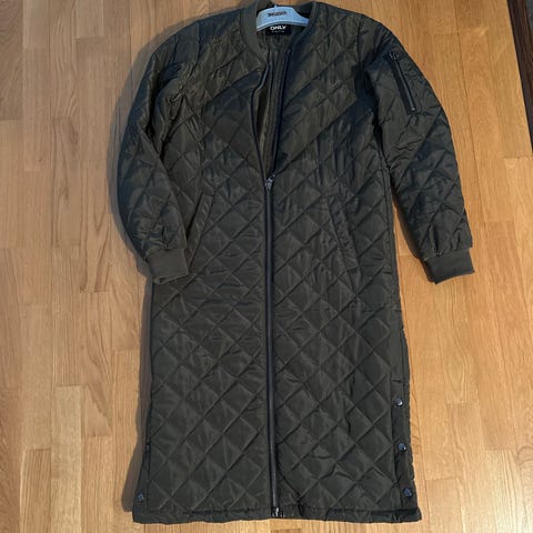 Vero Moda pitkä naisten välikausitakki koossa S. Tikkiommel ja kevyt toppaus. Väri oikeasti oliivin-/armeijanvihreä. En löytänyt kunnossa moitittavaa.