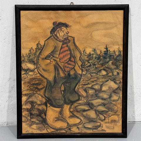 Kehystetty vanha piirros, jossa on kuvattuna hahmo kivikkoisessa maisemassa. Teos on signeerattu J L ja päivätty vuodelle 1915, mikä antaa sille historiallista arvoa ja kontekstia. Kehys on yksinkertainen ja musta, mikä korostaa teoksen värimaailmaa ja tyyliä.