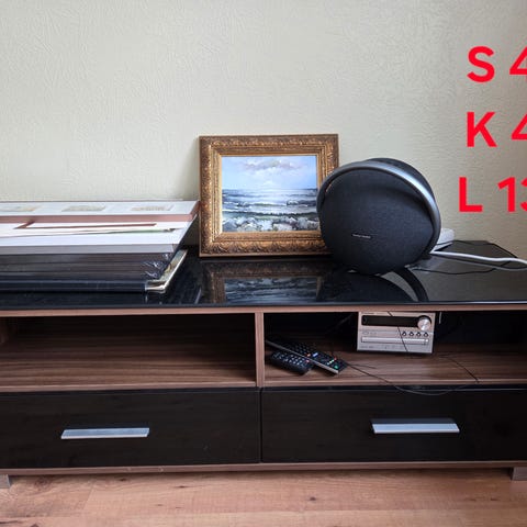 Toimii myös tv-alustana. Sisään mahtuu runsaasti mm. stereot, vinyylejä, vinyylisoitin kansineen, yms. Kaapeleille paljon läpivientiaukkoja ja tuuletusaukkoja.