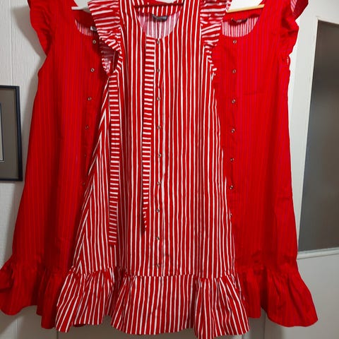 Esiliinassa on tasku. Pituus n. 63 cm, leveys n. 94 cm + nauhat 2 x n. 85 cm.