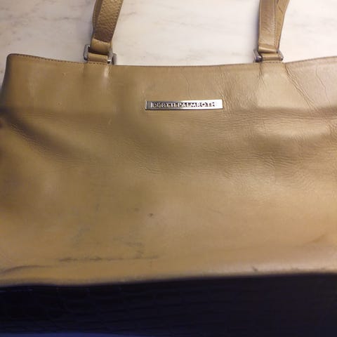 Pertti Palmroth käsilaukku. Vaimon ostos jo vuosia sitten, mutta on ollut käytössä vain ensimmäisen vuoden aikana. Pinta jotain sademateriaalia.