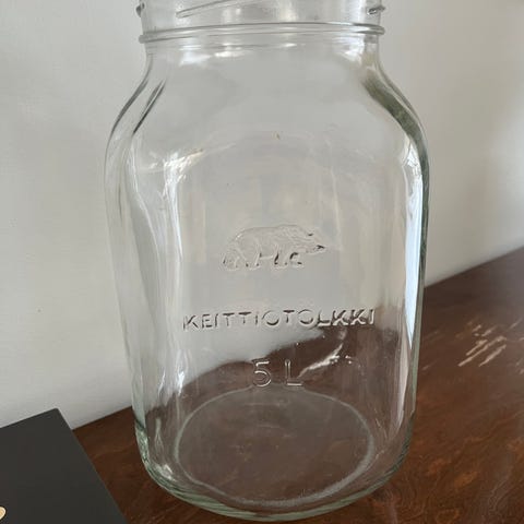 Aavistuksen vihertävää lasia. Lasimassassa muutama isompi kupla ja pikkukuplaa enemmänkin. Suuaukossa yksi lohkeama. Kantta ei ole.