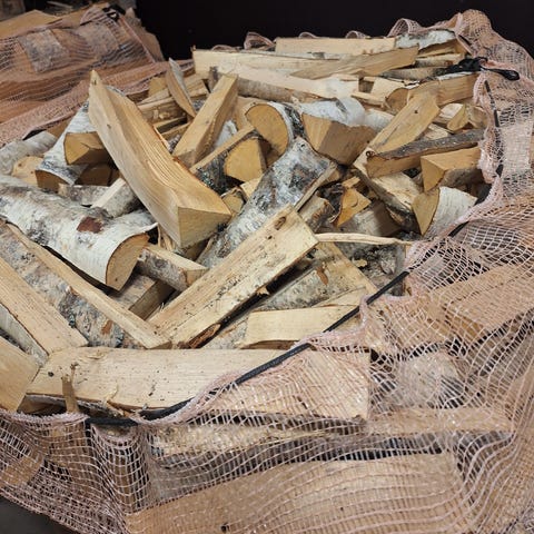 Koivuklapia 60 litran säkeissä. Puu on pilkottu klapeiksi ja pakattu verkkosäkkeihin, jotka on helppo kuljettaa ja varastoida.