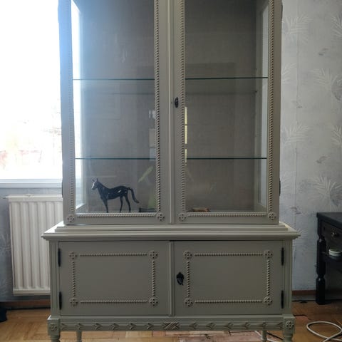 Kustavilaistyylinen uusvanha hopeakaappi/lasivitriini/astiakaappi, jonka alaosassa kolme vetolaatikkoa. Avain on tallessa. Hyvässä kunnossa. Ala- ja yläosa voidaan kuljettaa erikseen. Käytetään esim. koriste-esineiden ja astioiden esillepanoon ja säilytykseen. Kuvassa näkyvät astiat ja tavarat eivät kuulu kauppaan. Vain NOUTO Jämsästä, sovitaan aika erikseen ja saat sitten tarkan osoitteen. Ks. myös myynnissä oleva kustavilainen olohuonekalustesarja samalla.