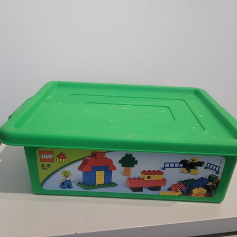 Oranssi ja keltainen lego-säilytyslaatikko. Ehjät, mutta pientä käyttö kulumaa havaittavissa.