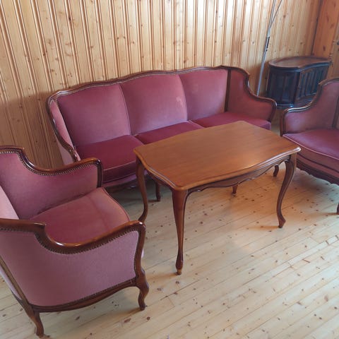 Laitalan uusvanha kustavilainen sohvaryhmä (vuodesohva, 2 nojatuolia ja sohvapöytä). Sohvan (n. L195, S60, K88) saa levitettyä sängyksi. Avattuna 195 x 96. Kuten lähikuvasta näkyy, niin nojatuolien istuinosan kangas on vähän jo kulahtanut mutta ehjä eli tuolien osalta kunto tyydyttävä, muuten hyvä. Sohvan päällikangas sen sijaan pysynyt paremmassa kunnossa - kalusteet olleet vähällä käytöllä, sohvaa käytetty pari kertaa vuodessa vierassänkynä. Ei eläintaloutta. Hinta jakaantuu siten, että sohva 160 euroa, nojatuolit 50 euroa kappale (hinnassa huomioitu kuluneempi kangas istuinosassa) ja sohvapöytä 100 euroa eli yhteensä koko kalusto 360 euroa. Voit myös tarjota ja jos haluat vain jotain kalustetta, laita viestiä mutta mieluiten myydään kaikki kerralla. Vain NOUTO Jämsästä.
