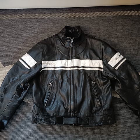 Nahkainen musta takki. Edessä vetoketjukiinnitys ja kauluksessa solkikiinnitys. Takissa on vetoketjutaskut edessä sekä säädettävät hihnat helmassa. Selkäpuolella useita leikkauksia, jotka antavat takille muotoa. Sopii käytettäväksi arkitakkina viileämpiin säihin.Kaatumissuojat mukana.