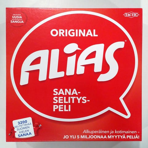 Myydään ensimmäinen Alias-peli. Ikäsuositus 3+. (Kuvakortteja voi käyttää sanojen oppimisessa jo aiemmin.) Kaikki osat ovat tallessa.