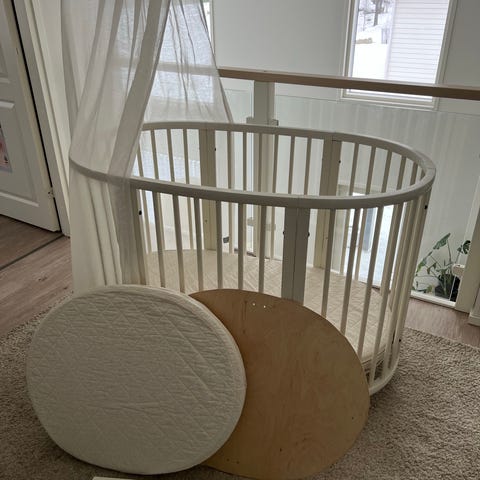 Mukana uudintanko, irrotettava etuseinä, 2 patjansuojaa ja 2 lakanaa.