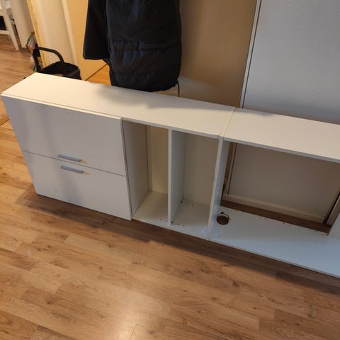 Toimiva kaappi. Kaksi laatikkoa ja yläosassa lasiovet ja lasihyllyt