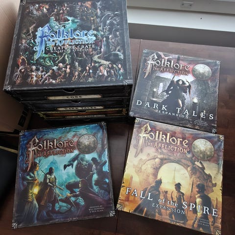 Folklore: The Affliction (2018). Englanninkielinen. Pelkkä peruspeli, kerran pelattu kampanja läpi. Kortit suojissa. Laatikon kulmissa hienoista kulumaa. Hahmolappuihin ei ole tehty merkintöjä. Hinta 30e.