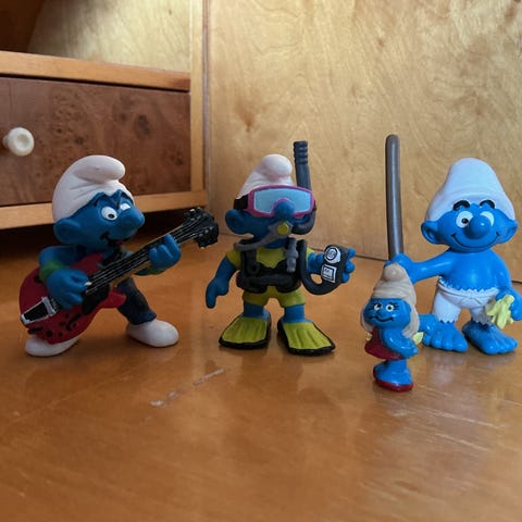 Schleich Smurffit muovifiguurit. Setissä useita eriaiheisia sinivalkoisia muovisia Smurffi-hahmoja, mukana mm. hoitajasmurffi, pellehahmo ja muita klassisia hahmoja. Figuurit on merkitty pohjasta Schleich-tekstillä ja vuosiluvuilla 1977-1981 sekä Beyo-merkinnällä. Sopivat esimerkiksi leikkeihin, keräilyyn tai koristeeksi. Myydään myös yksittäin 5€/kpl.
