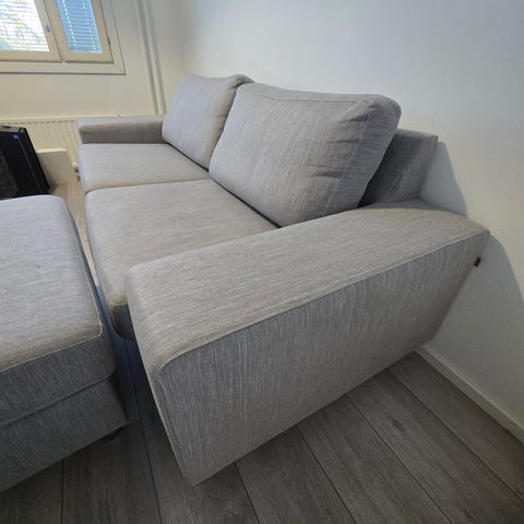 Käytetty kangassohva. Saa kahteen osaan, irtonaiset istuintyynyt ja niskatuki. Istuinpäälliset pestävissä.