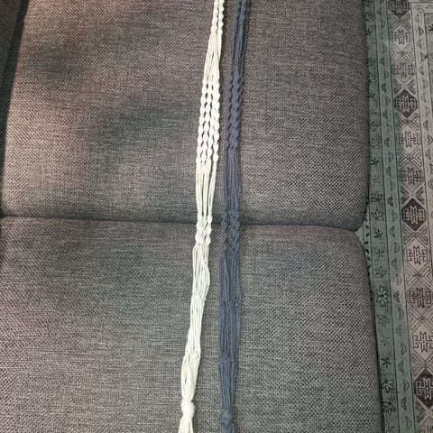 Kolme itsesolmeiltua amppelia. Kokonaispituus n. 80cm. N. 14cm ruukulle. Tummanharmaita, yhteishintaan 12€