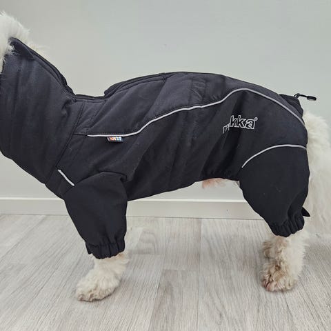 Lämmin softshell-haalari, jossa säänkestävä kangas ja pehmeä teddyvuori, suojaa koiraa kylmältä ja tuulelta. Ylellinen teddyvuori lämmittää ja tuntuu miellyttävältä päällä. Selässä olevan vetoketjun ansiosta haalari on helppo ja nopea pukea. Säädettävä pääntie ja säädettävä vyötärö viimeistelevät istuvuuden ja maksimoivat suojan. Säädettävät lahkeensuut varmistavat, ettei kylmä tuuli tai kura pääse sisään ja reidet pysyvät lämpiminä. Haalarissa on heijastavat tereet ja heijastava logo.