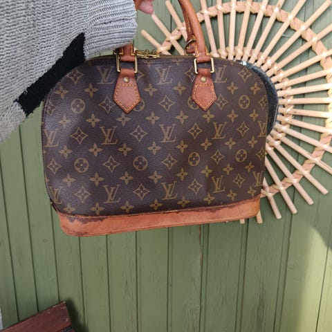 Louis Vuitton Alma nahkalaukku naisille. Laukku on valmistettu nahasta ja siinä on kantokahvat sekä vetoketjusuljenta. Ulkopinnassa on Louis Vuittonin monogram-kuviointi ja nahkaiset yksityiskohdat. Vetoketju toimii ja kantohihnat ovat vahvat ja ehjät. Ehjä, mutta nahan pinnassa näkyy käytön jälkiä. Datecode löytyy laukusta, mutta kuitti ja aitoustodistus puuttuvat.