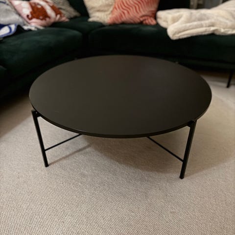 Valkoinen Hakolan Round -sohvapöytä 70 cm halkaisija. Pöydän pinnassa hieman haaleaa jälkeä, ja reunassa muutama kolhu (nämä näkyy 3. kuvassa). Yleisilme kuitenkin mielestäni vielä siisti.