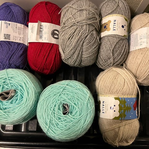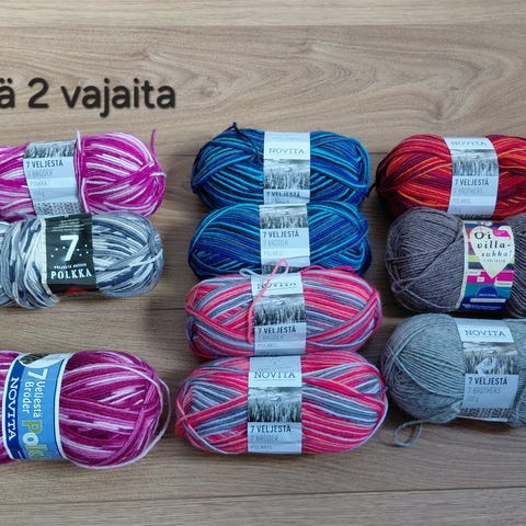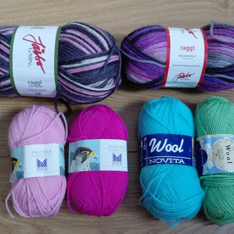 Käyttämättömät/täydet 100 g kerät. Kaksi tummanpunaista ja yksi vaaleampi. Kamera vääristää vaaleanpunaisen kerän sävyä, se ei ole noin kirkkaan pinkki. Veikkaan kyseessä olevan sävy vadelma.