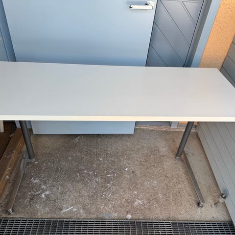 Pöytä on ehjä ja toimiva mutta työtason päällä on naarmuja ja käytön jälkiä.