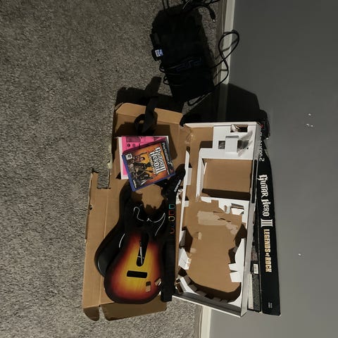 Sony Playstation 2 -pelikonsoli. Mukana kaksi ohjainta, tarvittavat kaapelit ja useita muistikortteja sekä Guitar Hero ohjain.