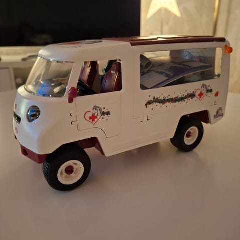 Hymer matkailuautolelu. Valkoinen pienoismalli, katolla kattoluukku ja muita yksityiskohtia. Katon saa irroitettua. Sisätiloissa on kiinteät matkailuauton kalustus, kuten istuimet, pöytä, keittiö ja makuutiloja muistuttavat osiot. Sopii mm schleisch figuureille. Pituus näkyy kuvissa mittanauhan vieressä. Nouto Pirkkala