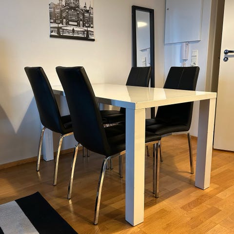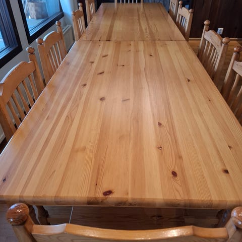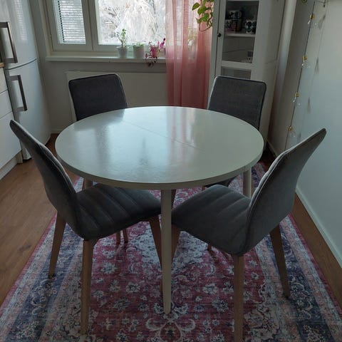 Pöydänpinta hyvässä kunnossa. Tuolien jaloissa kulumaa, näkyy kuvissa. Pöytä ja 6 tuolia. Myydään yhdessä tai erikseen kuvissa näkyvän toisen samanlaisen(vähän lyhyempi) ryhmän kanssa. Yhdessä hinta 60e. Sisältää yht 10 tuolia.