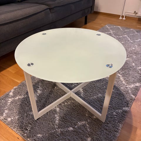 Kaksitasoinen sohvapöytä. Alempi kerros puukuviolla, päällä lasikansi. Jalat ja kannen reuunat metallia. Halkaisija 75cm, korkeus 45cm. Lasikannessa naarmuja, jotka näkyy tietyssä valossa. Viimeisessä kuvassa näkyy millaisia.