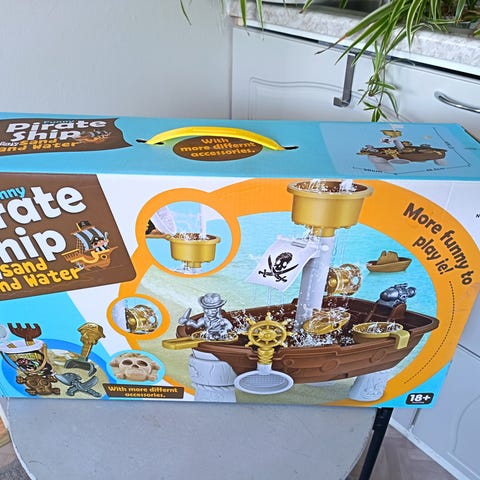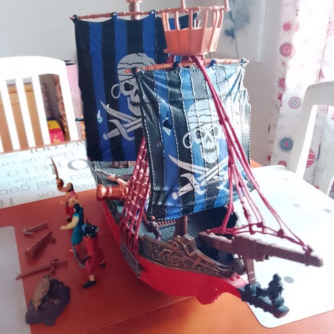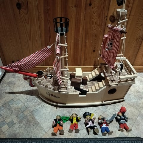 Barbarossa puinen merirosvolaiva lelu. Laiva on hyvässä kunnossa, jäänyt vähäiselle leikille. Laiva on maalattu mustan, punaisen ja keltaisen sävyillä ja siinä on mustat merirosvoliput pääkallokuvioilla. Rungossa on useita yksityiskohtia, kuten ikkunakuvioita ja köysirakenteita. Kannella on portaat, luukku, ankkuri, tykki (sillä voi ampua tykinkuulia 2 kpl) ja avattava peräramppi. Laivan korkeus n. 39 cm ja merirosvot n. 10 cm. Huomio, että yksi köysitikkaan kiinnitys irronnut, ei muuta vikaa.