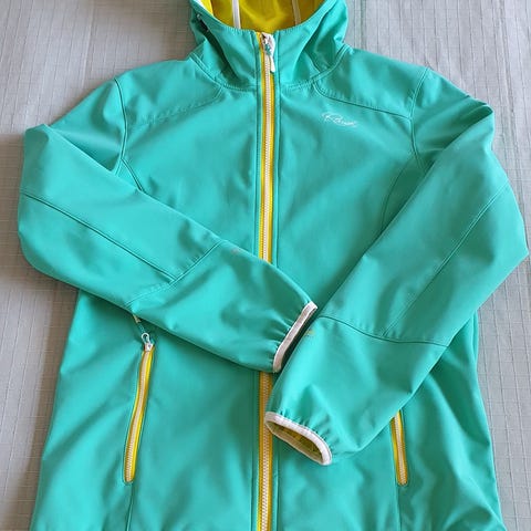 Joustava softshell materiaali, selässä ohuempi palanen liikalämmön poistoon, reilusti heijastimia ja hihojen suussa joustavasta materiaalista sisäresorit. Todella hyvä takki, jäi vain toisen puvun hankinnan myötä tarpeettomaksi. Käy mihin tahansa ulkoiluun.