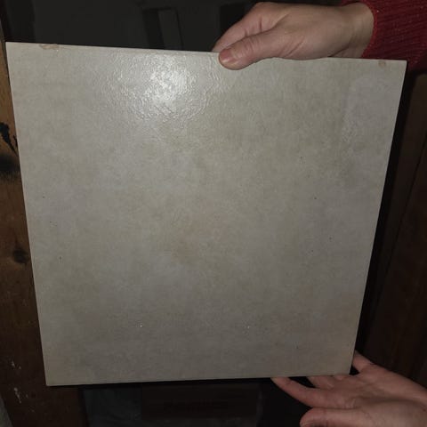 Kaksi laatikkoa (a 1,44m2) per laatikko ylijääneitä lattialaattoja.