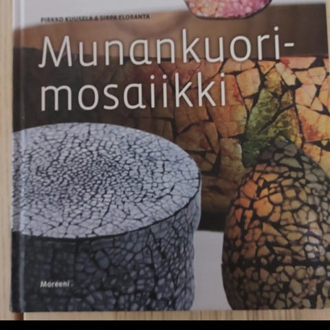 Tarjolla Pirkko Kuuselan & Sirpa Eloranta munankuorimosaiikki -kirja, jonka avulla luot kulhoja, sydämmiä, kelloja, rasioita, kulhoja, lampunjalkoja jne.