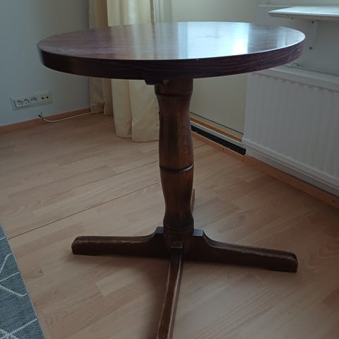 Tukeva, puinen ruokapöytä. Pinnassa pieniä elämisen jälkiä.