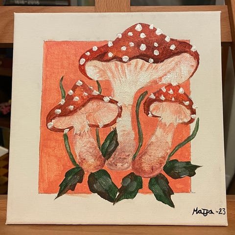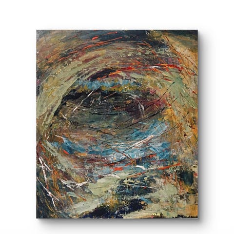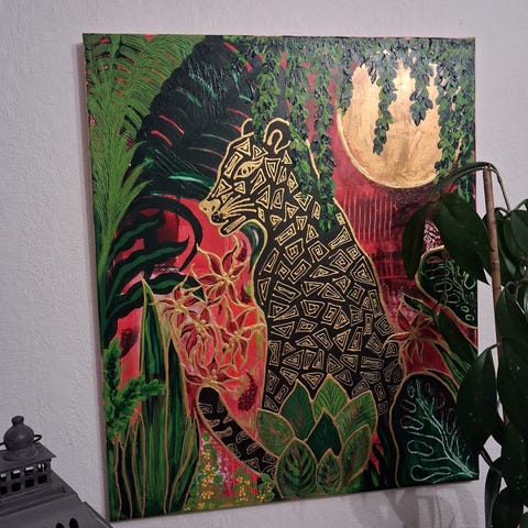 Taulussa on suurikokoinen tukaani, jonka musta vartalo ja kirkkaanoranssi nokka erottuvat voimakkaasti syvänsinistä taustaa vasten. Lintua ympäröivät rehevät vihreät lehdet, köynnökset ja pienet kukat, jotka luovat trooppisen ja elävän tunnelman. Kultainen kuu tuo teokseen lämpimän kontrastin viileisiin sävyihin. Koko: kork. 50 cm x lev. 40 cm. Takana metallinen ripustuslanka.