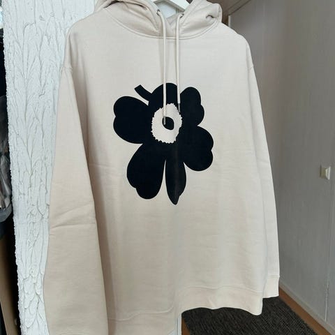 Marimekko huppari, koko L. Väri beige, edessä ja takana suuri punainen kuviopainatus. Materiaali puuvillaa. Hupussa kiristysnyörit. Soveltuu miesten tai naisten vapaa-ajan käyttöön.