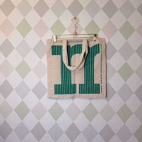 Marimekko Piccolo kangaskassi unisex. Kassi on valmistettu kankaasta ja siinä on suuri vihreä raidallinen Piccolo-kuvio vaalealla pohjalla. Kankaassa on lyhyet kantokahvat.