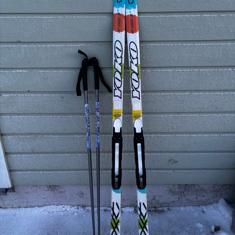 Kuvan suksipaketti. Sukset 130 cm, sauvat 105 cm ja monot 31. Meillä ollut käytössä 5-6 -vuotiaalla. Iissä asemanseudulla.