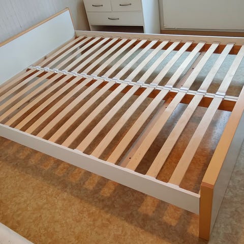 Puinen IKEA DOCCA parisänky, yöpöydät ja pöytälamput