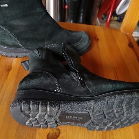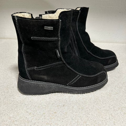 Hyväkuntoiset ihanalla turkisvuorella olevat nilkkurit grip+ pohjat eivät ole liukkaat, vetoketjut kunnossa pinta mokkanahkaa siinä hieman jälkeä kuljetuista kilometreistä muuten kunnossa. Ei goretex.
