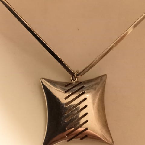Kaunis hopeinen kaulakoru panssariketjulla 1970-luvulta. Riipuksen halkaisija n. 2,5 cm ja ketjun pituus 42 cm. Leima 925.
