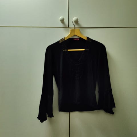 Vyötäröllä kuminauhaa, kangas itsessään ei jousta. Kainalo-kainalo mitta noin 50cm.